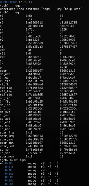 The above listing shows OpenOCD/GDB connected to a Nano 5G a while after it has been first scanned via JTAG. It seems to be stuck in a permanent 'data abort' handler loop, with some pretty trashed register values (although some of them are still in valid range for running | The above listing shows OpenOCD/GDB connected to a Nano 5G a while after it has been first scanned via JTAG. It seems to be stuck in a permanent 'data abort' handler loop, with some pretty trashed register values (although some of them are still in valid range for running the BootROM). | ||