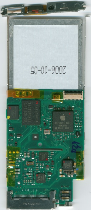 | 1 | CPU | Samsung S5L8701 | 337S32918701, N042DQS, 0636 ARM | System On Chip (SoC), includes ARM940T central processor, advanced DSP, 50kB boot ROM, 176kB SRAM, external RAM, flash and LCD controllers, USB(1.1-host; 2.0-function) and some other parts. Package: 232-pin FBGA 10x10mm or 224/226-pin 9x9mm. Similar chips: SA58700X07. Some documentation available for the S5L series can be found here. The processor itself is Apple-branded and marked 337S3291 8701. |