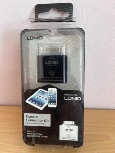 The Apple Camera Connection Kit is a 30-pin accessory, mainly for iPads. It exposes either a USB-A port, or a SD card slot. Its intended purpose is to allow users to transfer photos from their digital cameras, to their iPad's Photos app.