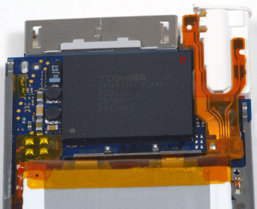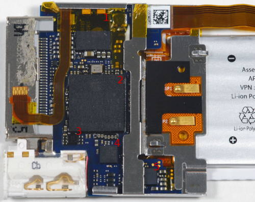 | 5 | Audio codec | CS42L58 | 338S055C, 189N0824, SGP | I determined this because the iPod nano (5th generation) has a similar chip, which we are sure of the identity. One person lifted this chip and found that the pins connect to the LCD connector. Not much info was given, and it could just be a common ground, but the identity of this chip is still up in the air. |
