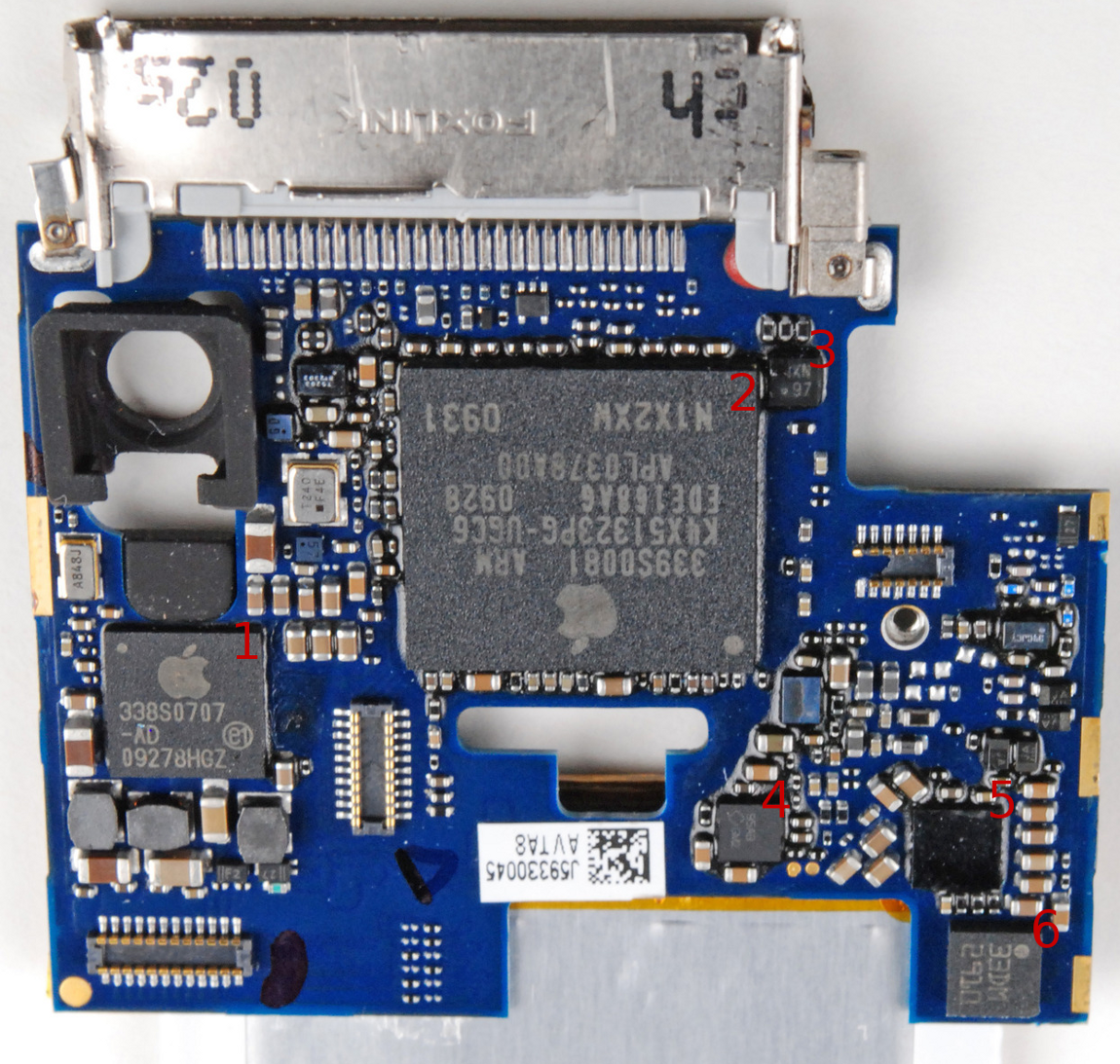 | 2 | CPU | Samsung S5L8730 | 339S0081 ARM, K4X51323PG-UGC6, EDE168AG 0928, APL0378A00, N1X2XW 0931 | Printed backwards on the chip - how sneaky. ARM1176JZF-S core (per CP15 data). |
